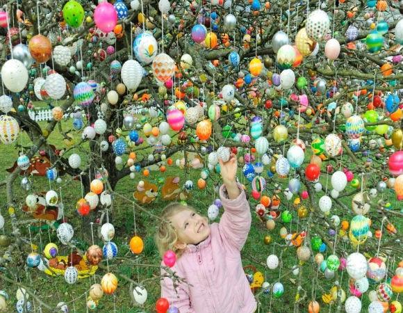 Дърво, украсено с над 10 000 яйца, също заслужава внимание, не мислите ли!? Тази необичайна и предизвикваща истинска радост гледка се намира в немския град Заалфелд. Собственик на това иначе ябълкова фиданка е съвсем обикновен пенсионер на име Фолкер Крафт. Той разказва, че за първи път вижда подобна гледка в детството си, тя се запечатва в съзнанието му и решава, че един ден той също ще сътвори нещо толкова красиво.